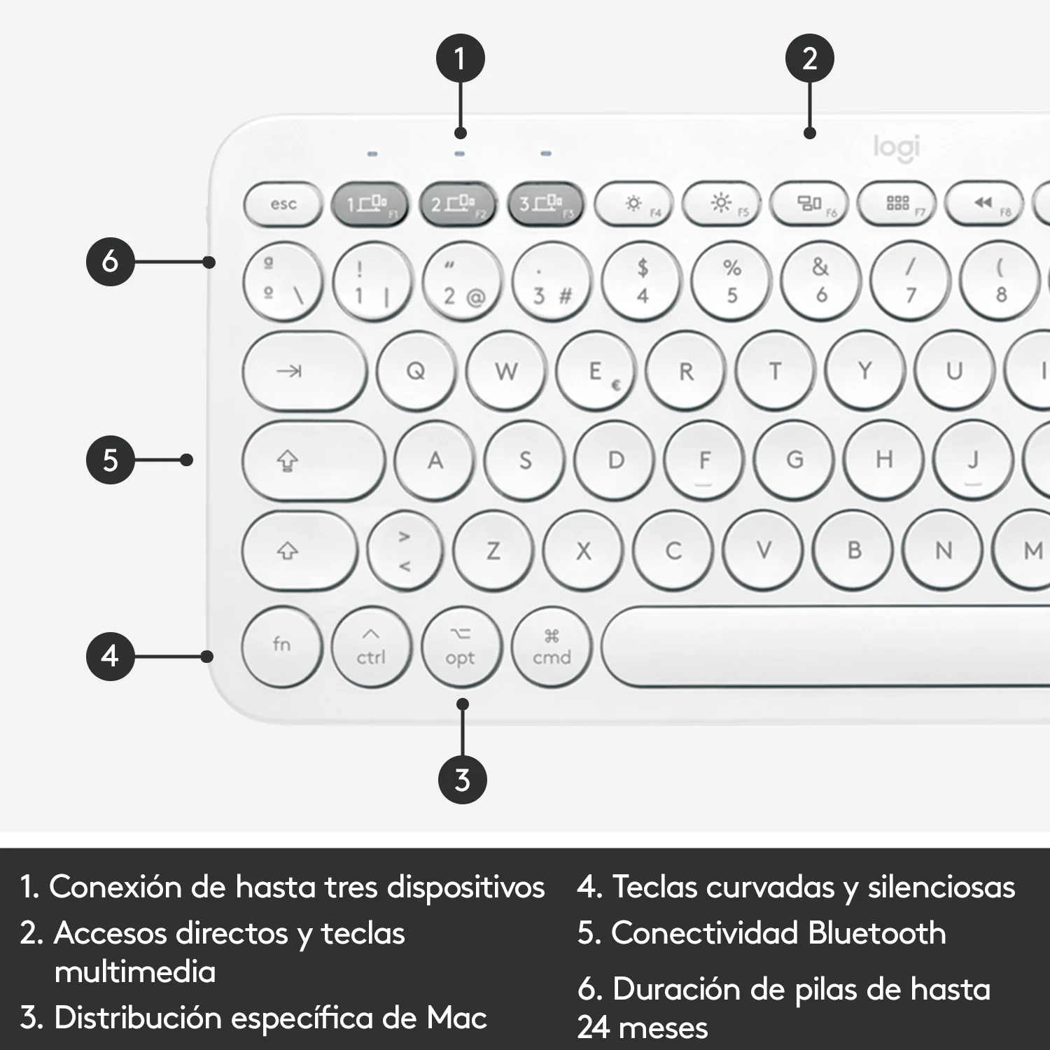 El teclado Bluetooth® Logitech® K380 para Mac, PC y dispositivos móviles transforma cualquier espacio en un entorno minimalista, moderno y multidispositivo, permitiéndote escribir en tu iPhone, iPad, MacBook, iMac y más*. Con la capacidad de conectarse a tres dispositivos simultáneamente, puedes cambiar de uno a otro al instante.